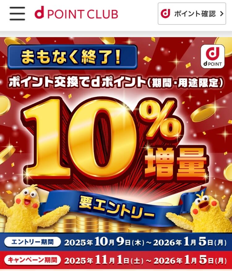 またまたやってきました!「ポイント交換でdポイント10%増量キャンペーン」他社ポイントをdポイントに10%アップで交換できるお得なキャンペーンです。